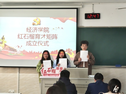 会上胡皓首先介绍红石榴育才矩阵的成立背景他提出红石榴育才矩阵的成立既是倡导民族团结,也是提升学生的综合素质和创新能力,培养更多高素质人才,为学校注入新活力。接下来由学生代表张莹皮道坤上台发言经济学院优秀学生代表与少数民族同学签订了结对承诺书。