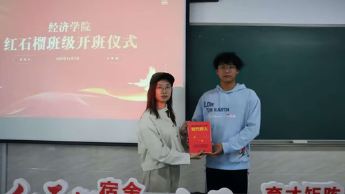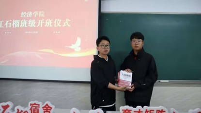 经济学院学工办副主任夏一程与辅导员徐小昀为红石榴班级代表赠书,表达学院对同学的祝福和期望,这些书籍不仅有纪念意义,更能够激励他们在未来的学习和生活中更加努力奋斗。
