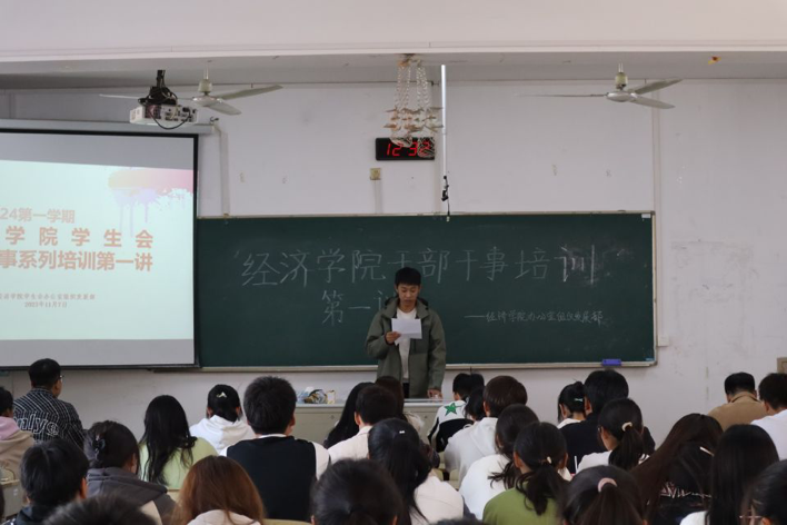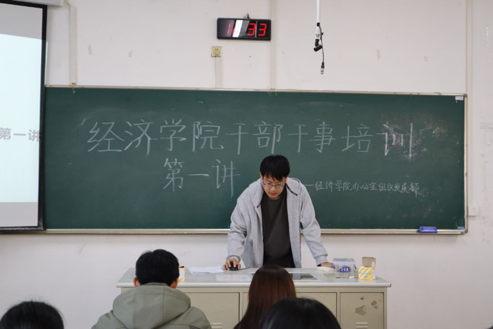 为了让经济学院学生会新进干事更快适应新的环境,高效配合部门完成内部工作,增强自我教育、自我管理、自我监督的意识。11月7日中午,经济学院学生会办公室组织发展部特联合其他部门开设2023-2024学年学生会干部干事培训系列讲座第一讲。经济学院学生会主席团及各部门干部干事出席本次活动,章子涵主持干部干事培训第一讲。