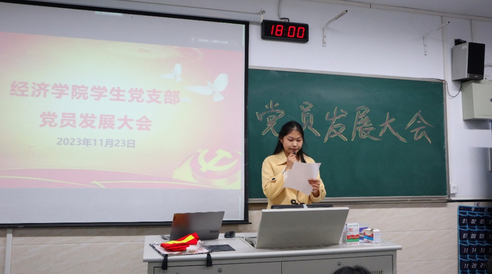 为深入学习贯彻党的二十大精神,进一步为党组织注入鲜活生命力,延续红色血脉,凝聚奋进力量。11月23日晚,经济学院召开2023年度党支部党员发展大会,经济学院学生党支部书记荣文婷、经济学院辅导员纪有福、徐小昀及部分正式党员参加本次大会。