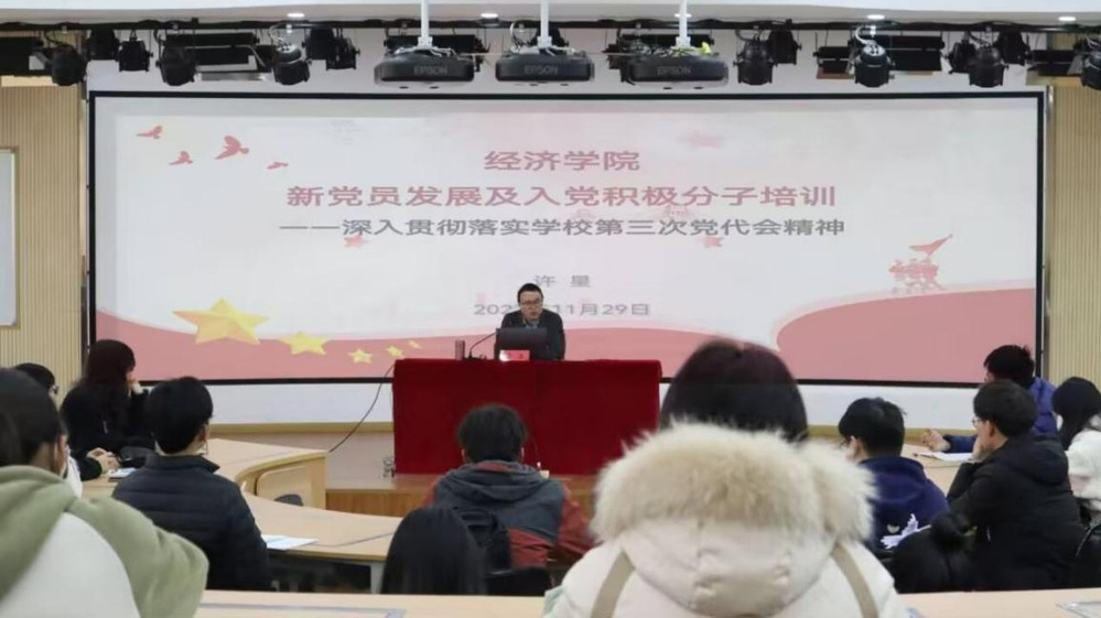 帮助经济学院学生会各干部干事深入学习我校第三次党代会精神,树立正确入党动机。1129中午,经济学院团委于2号楼四楼报告厅开展学生会干部干事培训系列讲座第四讲暨感悟思想伟力,凝聚奋进力量信仰公开课新发展党员与入党积极分子、团员和青年代表、学生会各部门干部干事等参加此次培训。本次培训由经济学院党委副书记、副院长许星领学经济学院团委副书记王军琦主持。