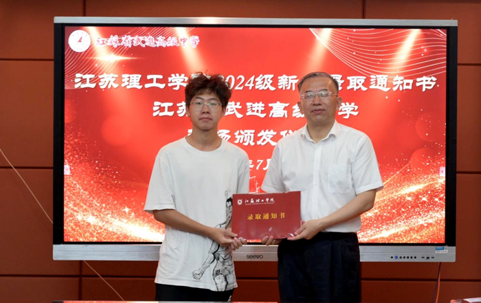 首先江苏省武进高级中学党委书记陈雯宇致欢迎辞,她对江苏理工学院领导一行来访表示欢迎,介绍了省武高的历史以及近些年省武高在教育教学方面取得的成绩,与江苏理工学院的相关合作情况。对毕业生考取江苏理工学院表示祝贺,表示省武高将以毕业校友们为荣为傲。随后副校长俞亚萍宣读2024年江苏省武进高级中学录取名单。校党委书记崔景贵向新生代表一一发放了录取通知书。武进高级中学学生代表张一帆作为新生代表发表录取感言,她表达了对母校省武高培养的感谢,以及对到江苏理工学院学习的憧憬和希望。最后,江苏理工学院党委书记崔景贵发表讲话,他首先代表学校向被录取的同学们表示热烈的祝贺,接着深入阐述了学校的教育理念和发展目标,介绍了学校在教育教学、人才培养、学生科技竞赛等方面取得的成绩。同时给新生们布置了特殊的暑假作业,希望大家思考中学与大学的区别,并激励在场的新生们要勇往直前、追求卓越,为实现自己的人生价值和社会责任而努力奋斗。