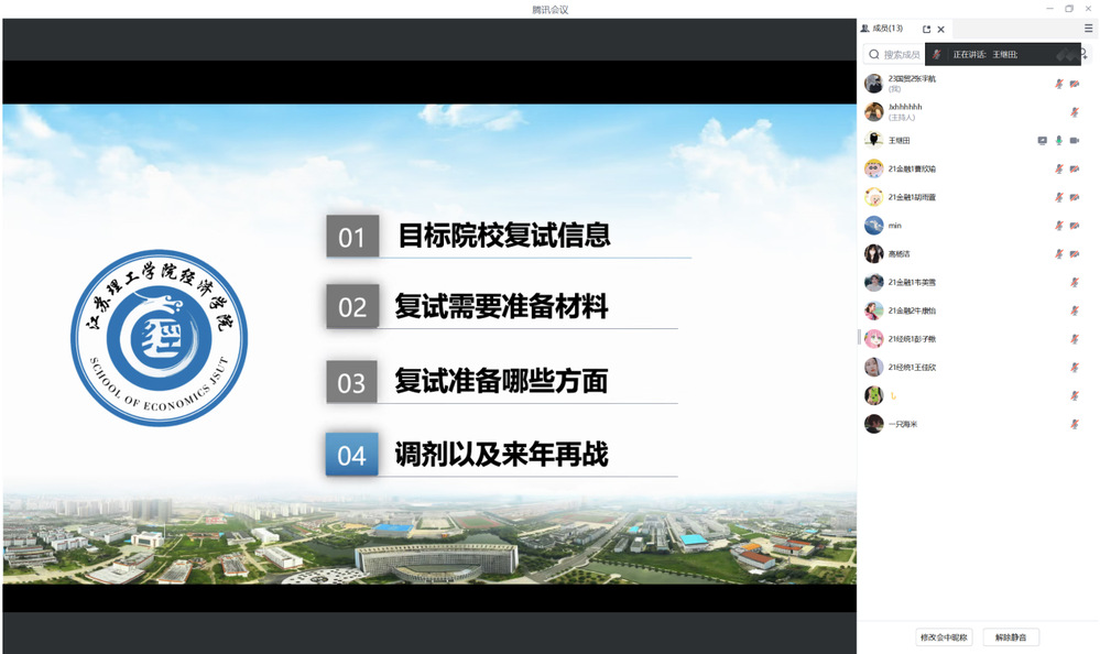 为了进一步提升毕业生的考研指导服务,帮助2025届考生增强复试能力,经济学院于3月4日晚7时在线上成功举办了2025年考研复试交流会。本次讲座特邀王继田博士担任主讲,由辅导员纪有福老师主持,2021级达到考研分数线的同学以及2022级和2023级的部分学生积极参与。